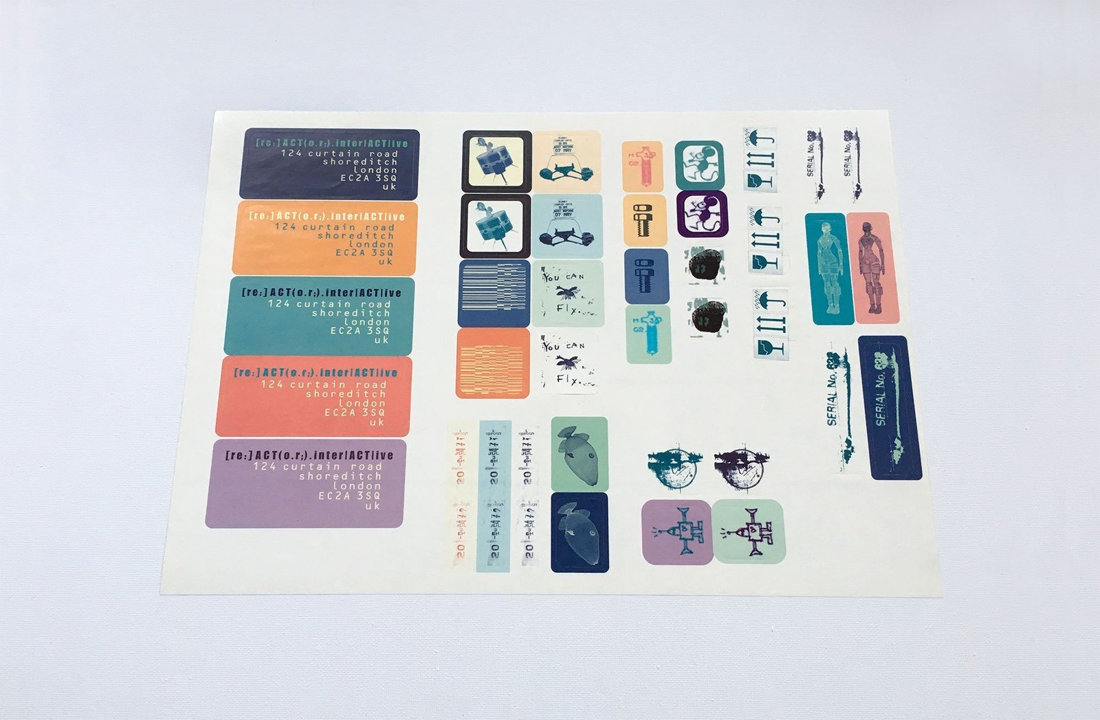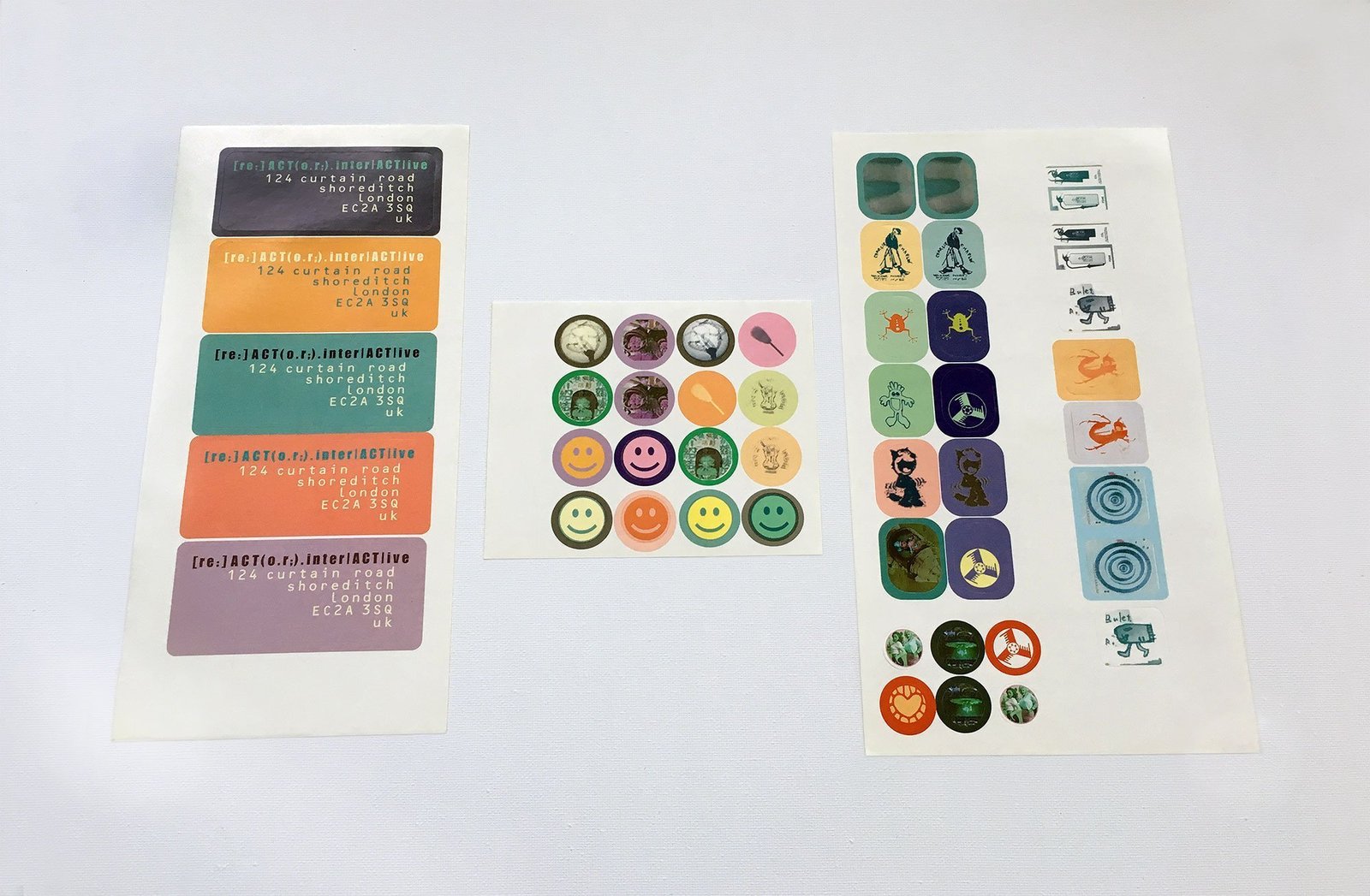 Particularly concerned with recycling and using elements of the streetart in the area, their stationary was especially interesting. In the studio was a container that members of Reactor filled with any suitable recycled material they found, which was then cut to size to use as business cards. Each individual card was quickly assembled using preprinted stickers of names, contact details and symbols, making each card a unique piece of art.