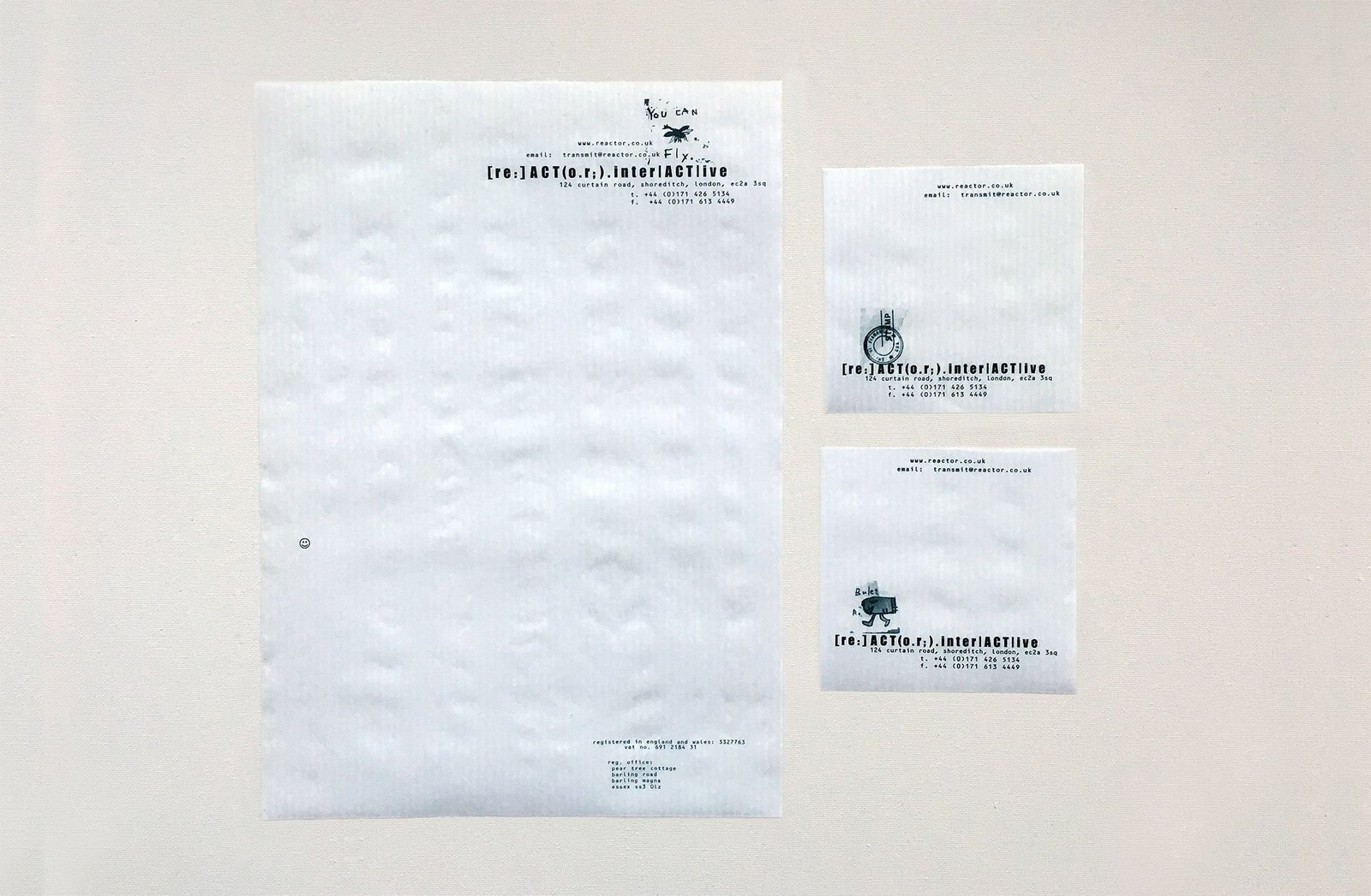 Letterheads and slips were printed on translucent stock, making a collaged design with anything placed underneath. Working with layers in realtime.